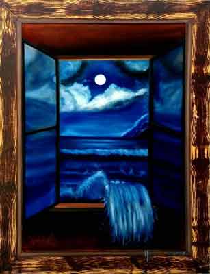 - Here as you can see the window is open and the reflection of the moonlight on the sea makes the sea water as like the sky.. And in the painting sea water is coming inside the window.. it does mean or here the artist mean as we can see the moonlight inside the room but we can't feel the sea water inside the room, but we continuously think about the situation if the sea water comes inside the room it will be a perfect and fulfilled moments for us..so its comes inside and fulfil your dream... the final note through the painting is- IF YOU WANT A THING CONTINUOSLY FROM CORE OF YOUR HEARE IT WILL DEFINATELLY COMES OR FULFIL ONE DAY. (it's a feelings). DREAM BIG FLY HIGH..)